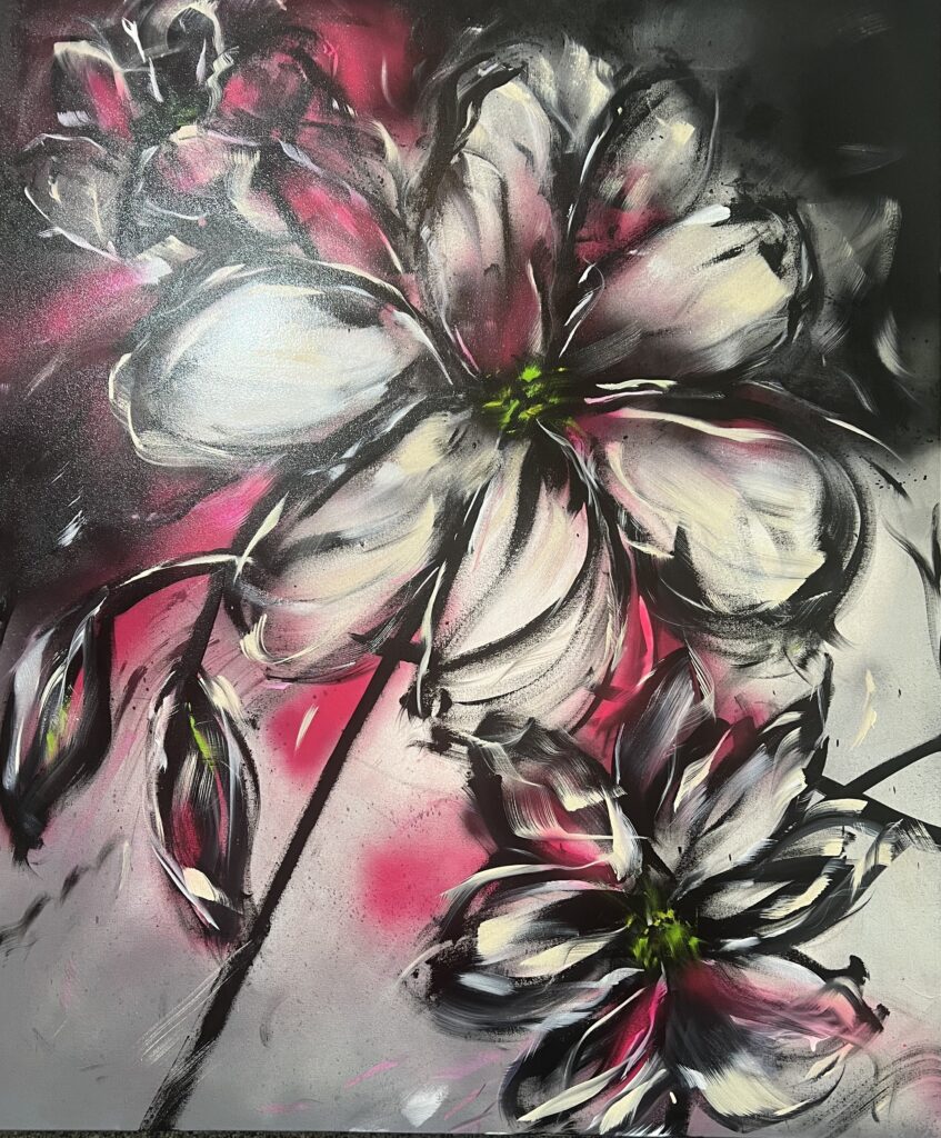 Bobbi notes that the featured work in her new series “explores the delicate balance between subtlety and expression, where each bloom speaks to the quiet power of individualism. In the interplay of neutral tones and bursts of color, the pieces reflect the hidden emotions that surface when we embrace our true selves. Each painting is a meditation on the ways we connect with our inner essence, offering a moment for the viewer to find their own soul’s reflection in the art.”