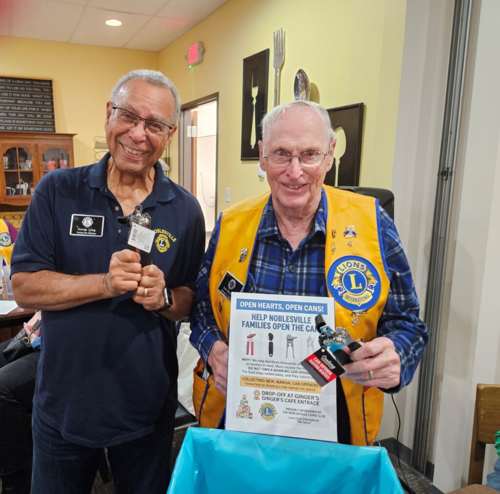 Noblesville Lions are collecting new, manual can openers to share with families who rely on local food pantries for support. Many families receive canned goods, but don’t own a working can opener. Community members can donate new, manual can openers at the entrance to Ginger’s Cafe during regular business hours. From left, Lions George Long and Bob Minton are among the first to donate can openers.